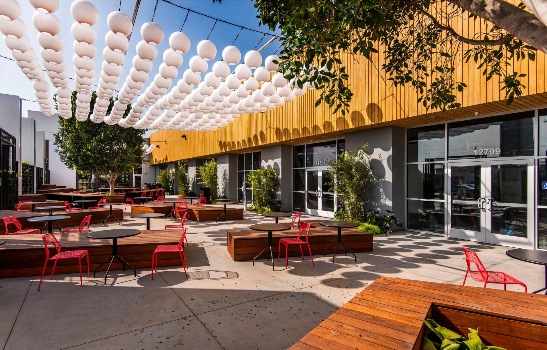 Rodeo 39 Public Market in Stanton, CA, was designed as a vibrant gathering space for enjoying meals and community under the California sky. Primus' Decostring, featuring 18" acrylic spheres in a striking grid pattern, provides shade by day and a glowing ambiance by night. This innovative design blends creativity with function, enhancing the market’s atmosphere while offering both comfort and visual appeal for visitors day and night.